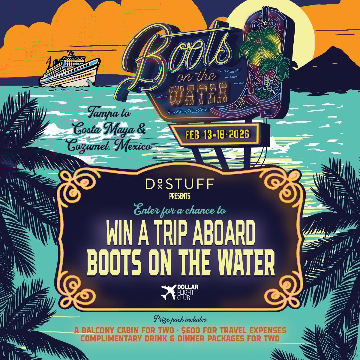 We’re giving away a balcony cabin for two aboard Boots on the Water Cruise, a five night cruise featuring Clint Black, Rodney Atkins, Terri Clark, Diamond Rio, and more. This round trip journey from Tampa to Costa Maya and Cozumel includes themed nights, onboard activities, a drink package, a dinner package, and a $600 travel stipend.